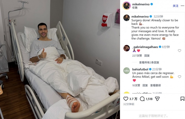 应力性骨折赛季报销!梅里诺社媒晒病床照报平安:手术已经完成