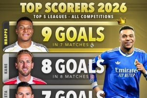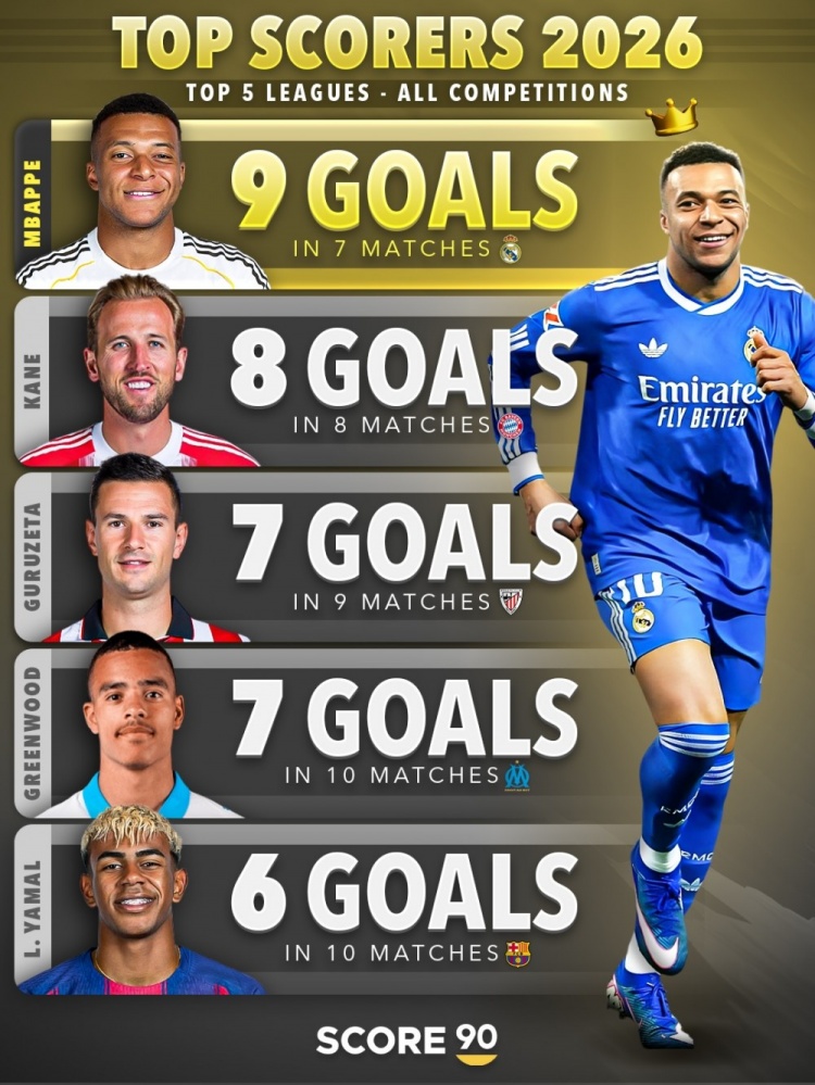 24直播网2月10日讯 Score90统计了五大联赛球员2026年各赛事的进球数量,并列出2026年进球榜,姆巴佩7场9球居首。