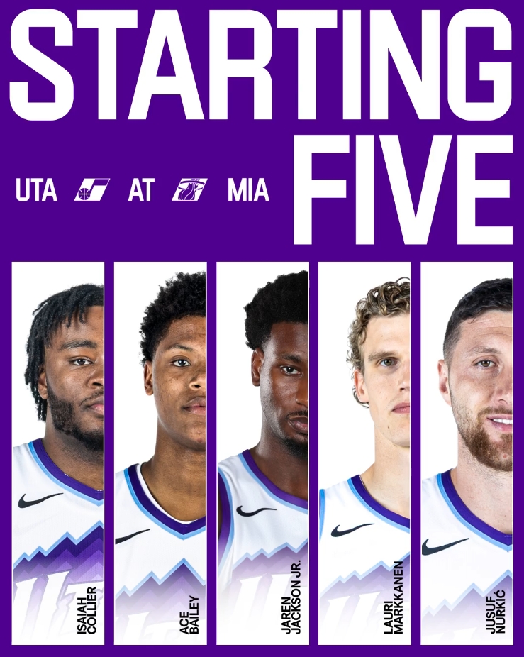 此役,爵士摆出了三塔阵容,让马尔卡宁(2米16)、努尔基奇(2米11)和新援小贾伦·杰克逊(2米08,JJJ)搭档先发,另外两人分别是以赛亚·科利尔和埃斯·贝利。