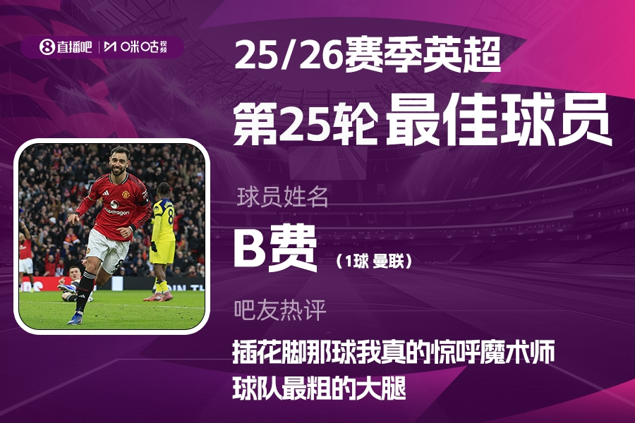 在曼联2-0热刺的比赛中,B费大师级表现串联全队,还打入关键进球,达成曼联生涯参与200球里程碑,率领红魔豪取4连胜,一记风骚插花脚更是引得吧友直呼“魔术师”!B费获得吧友52542票,高票当选【24直播网X咪咕体育英超第25轮最佳球员】!