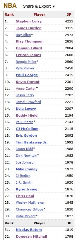 比赛中,骑士球星米切尔投进了本场第二记三分。至此,他的生涯三分命中数来到1800记,成为NBA历史第32个做到这点的球员!