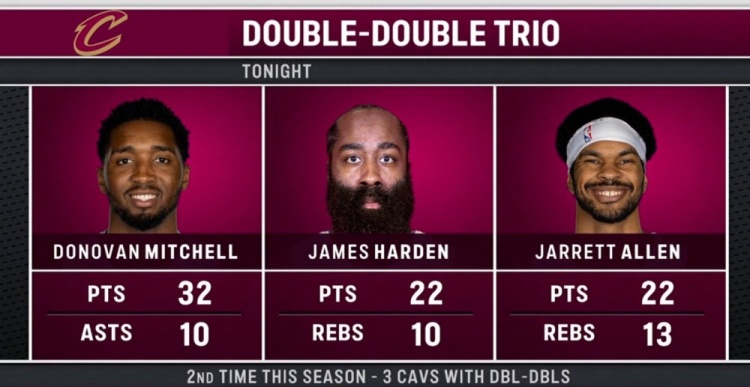 米切尔32分10助攻,哈登22分10篮板,阿伦22分13篮板