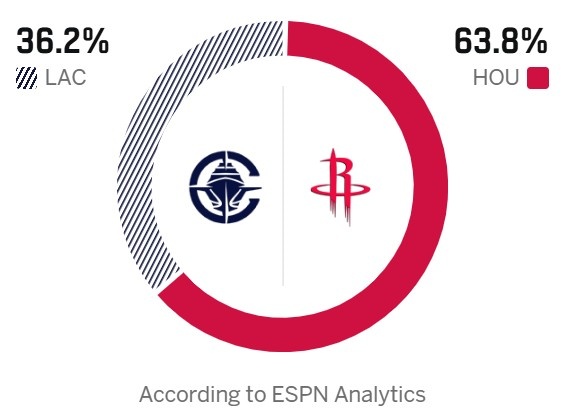 今天,ESPN预测本场胜率,快船36.2%,火箭63.8%。