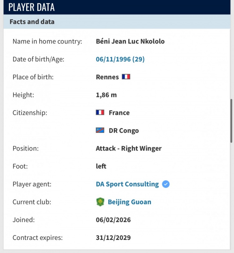 恩科洛洛的个人页面中显示,他于2026年2月6日加盟国安,合同有效期至2029年12月31日。