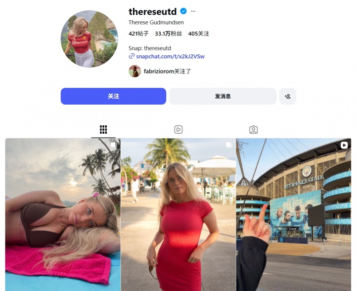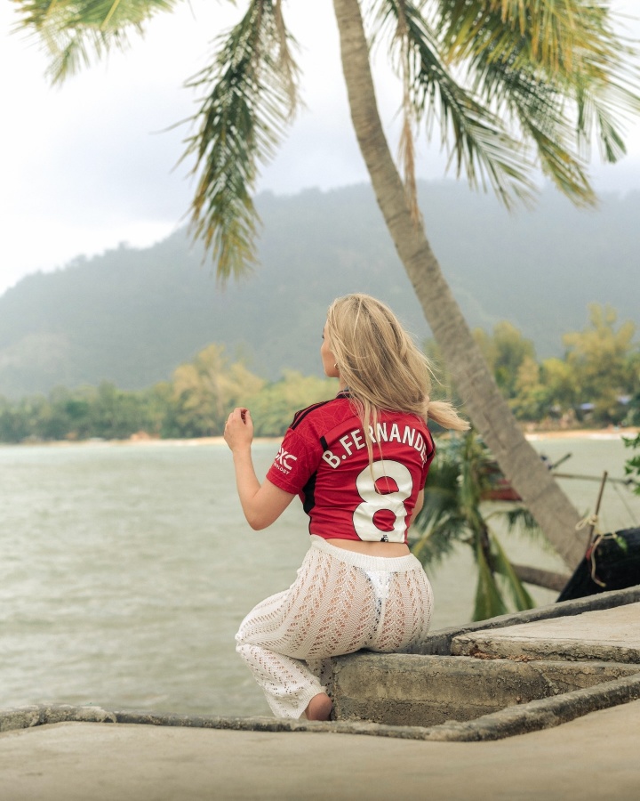 Therese Gudmundsen在Ins上拥有超过30万粉丝,平时她经常身穿曼联球衣拍摄写真。在最新的帖子中,她发布了自己在斯里兰卡度假的照片,她身穿比基尼躺在沙滩上摆pose拍照,还晒出一张自己享用水果沙拉的照片。