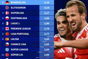 24直播网2月11日讯 德国转会市场盘点了本赛季欧洲前15大联赛场均进球数,荷甲以3.23球居首,德甲3.18球位居次席。