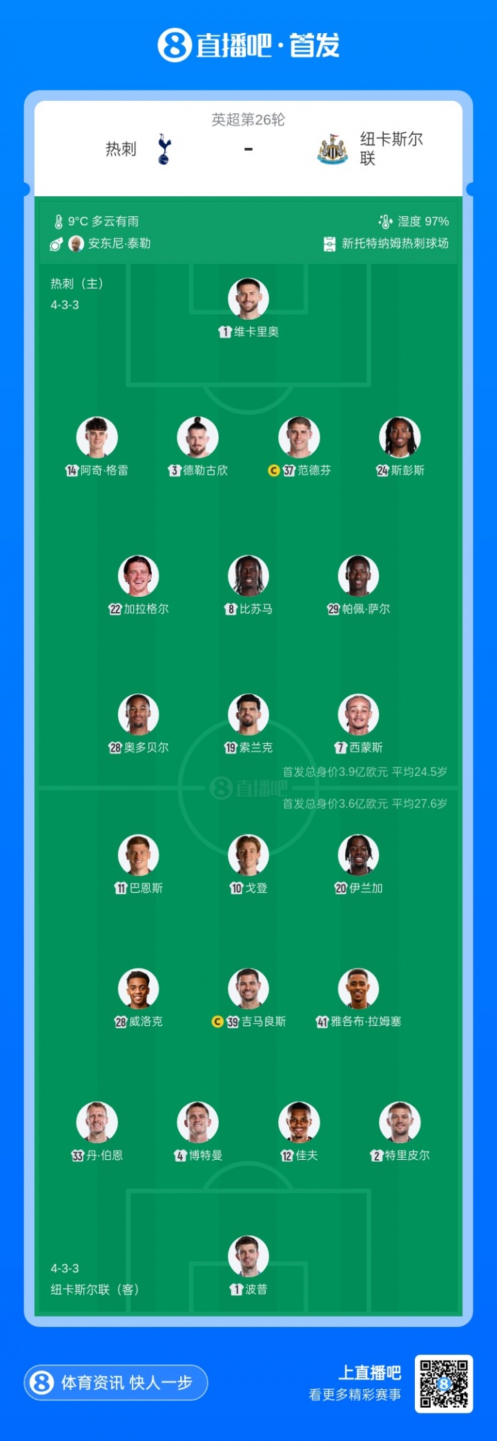24直播网2月11日讯 北京时间2月11日3:30,英超第26轮,热刺vs纽卡。赛前双方公布了本场比赛的首发名单。