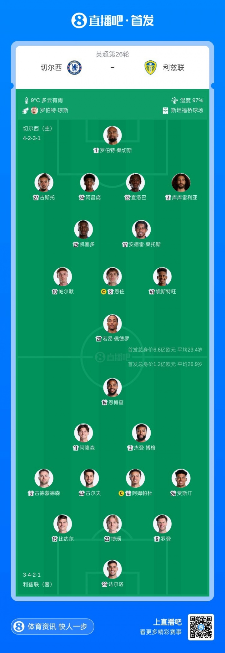 利兹联首发:26-达尔洛、6-罗登、23-博瑙、15-比约尔、24-贾斯汀、4-阿姆帕杜、44-古尔夫、3-古德蒙德森、11-阿隆森、2-杰登·博格、14-恩梅查