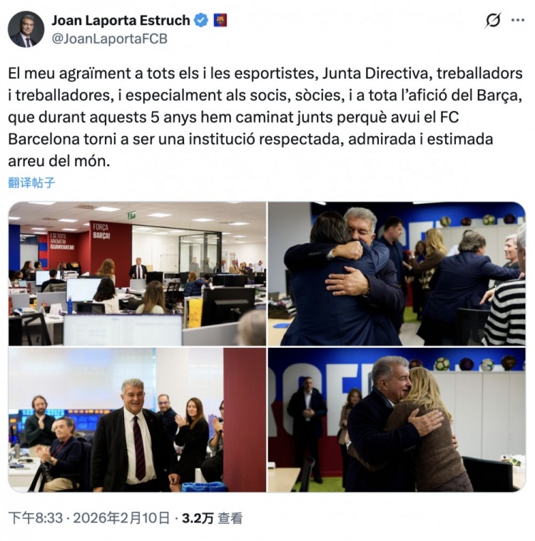 拉波尔塔写道:我要感谢所有运动员、董事会成员、员工,尤其是俱乐部会员和所有巴萨球迷,在过去的5年里,我们一路同行,共同努力,使今天的巴萨足球俱乐部再次成为全球受人尊敬、钦佩和喜爱的体育机构。