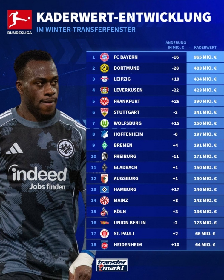 德甲球队冬窗之后身价排名: