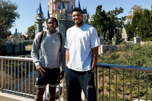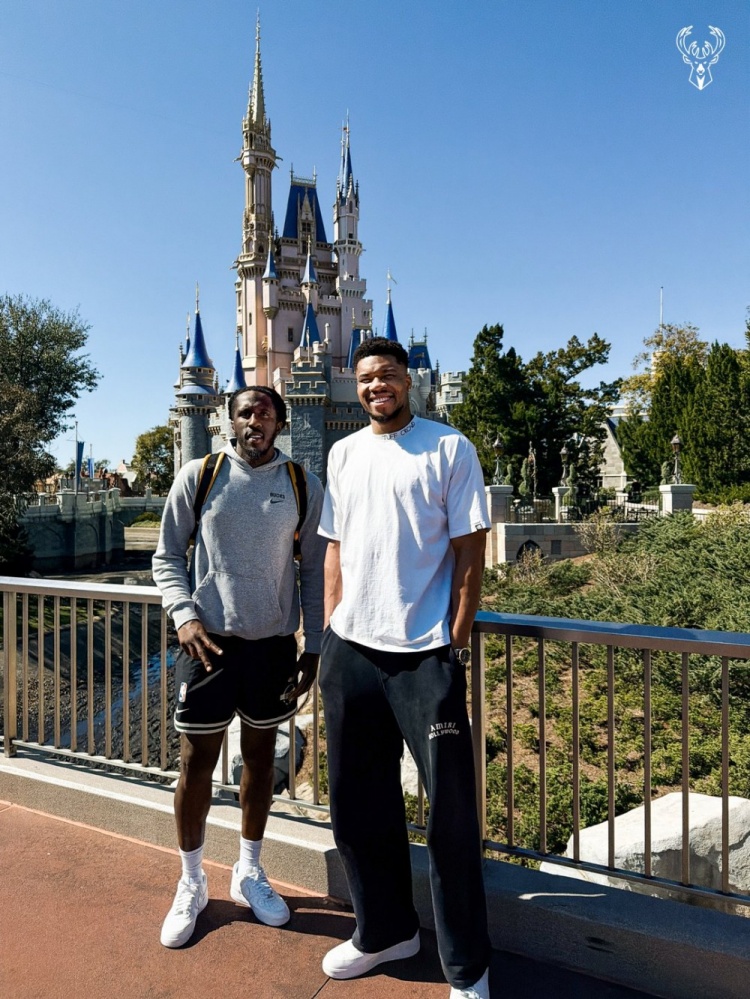 24直播网2月11日讯 雄鹿官方晒图,字母哥和托里恩·普林斯在奥兰多迪士尼游玩。