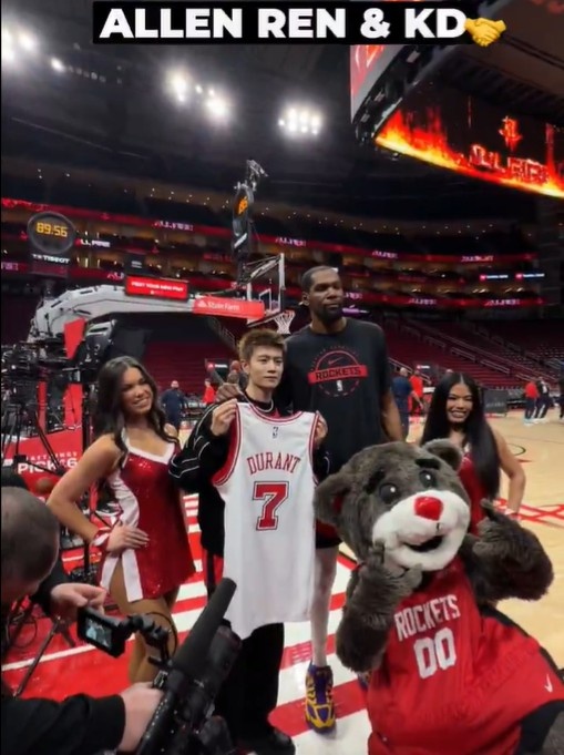 赛前,任嘉伦现身火箭主场,为杜兰特送上唐装作为礼物,后者送上签名球衣+合影留念。