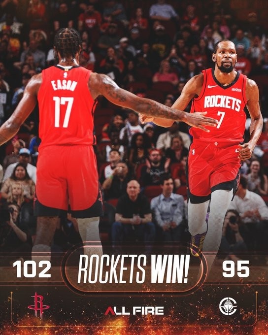 赛后火箭官方发布赢球海报,杜兰特和伊森击掌瞬间成为封面。