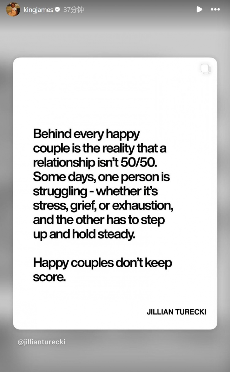 在比赛开始20分钟前,詹姆斯在INS转发了以下文字:“在每一对幸福的伴侣背后,都隐藏着一个事实,关系中的付出并非总是五五开。有时候,一方会因为压力、悲伤或疲惫而感到挣扎,这时另一方就需要挺身而出,给予支持和稳定。幸福的伴侣不会斤斤计较。”