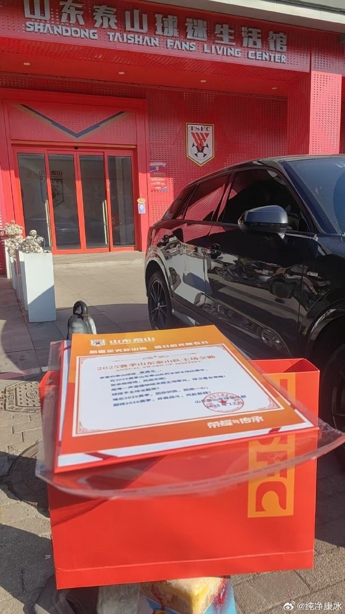 今天,康冰在个人微博晒出山东泰山主场全勤奖奖品,是一个荣誉证书+一套价值88元的文具礼盒。