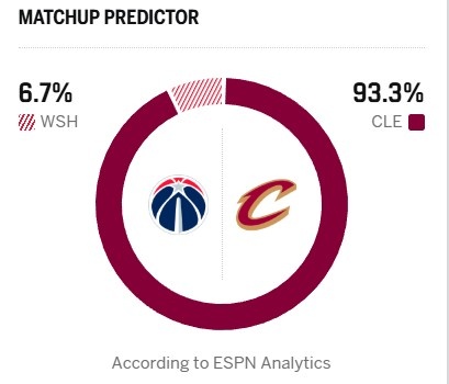 ESPN今日晒出本场胜率预测,骑士高达93.3%,奇才只有6.7%。