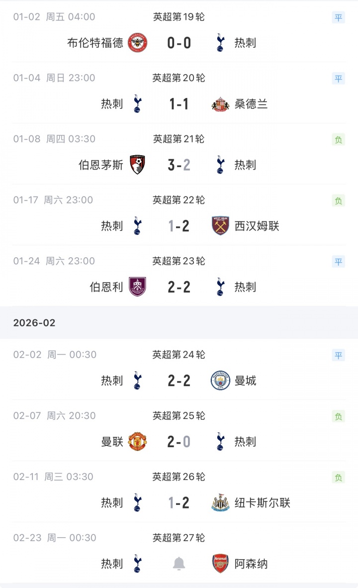 在凌晨1-2输给纽卡后,球队近8轮4平4负,近17轮只赢了2场。下轮比赛,热刺将对阵阿森纳。