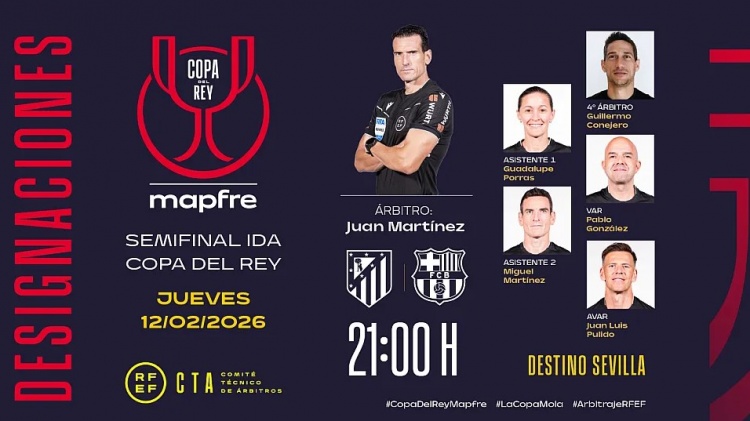 24直播网2月11日讯 北京时间2月13日凌晨4:00,国王杯半决赛首回合,马竞将在主场迎战巴萨。赛前,西班牙足协官方公布了本场比赛的裁判安排,胡安·马丁内斯执法。