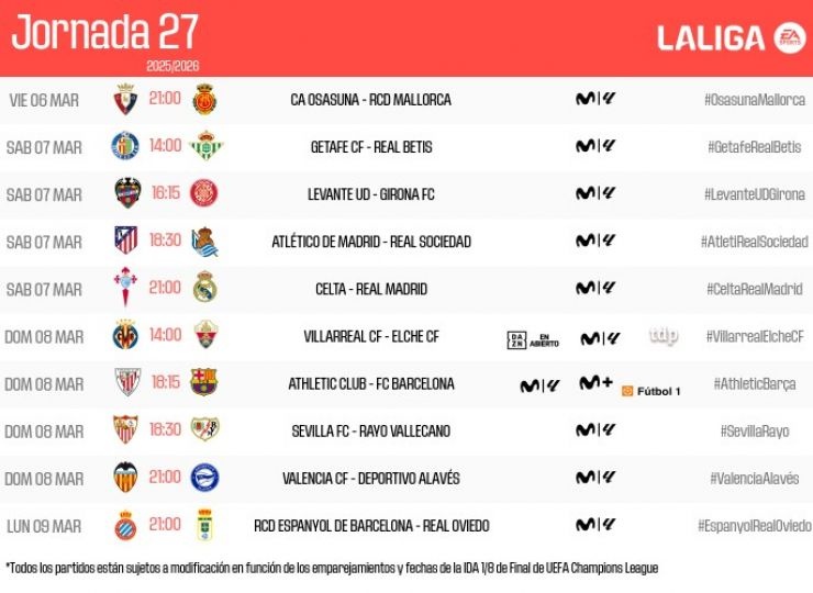 24直播网2月12日讯 西甲官方公布联赛第27轮各场开球时间,北京时间3月8日凌晨4点皇马客战塞尔塔,9日1点15毕尔巴鄂竞技vs巴萨。
