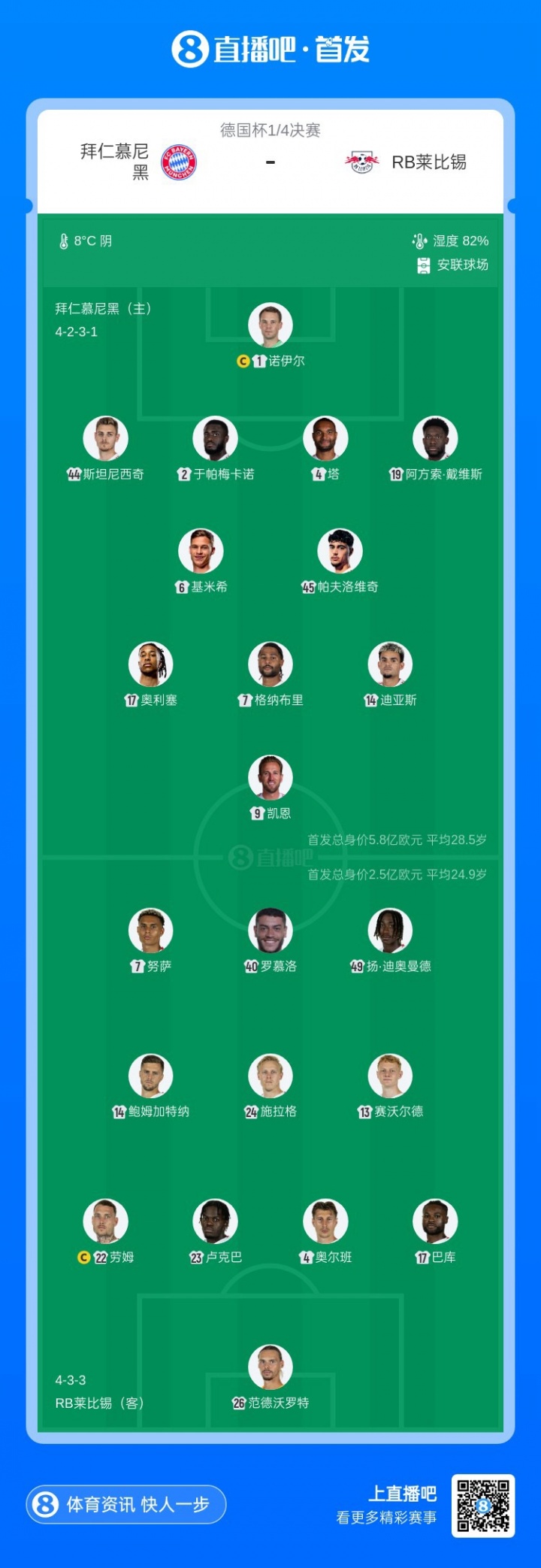 24直播网2月12日讯 德国杯8强对决,拜仁对阵莱比锡比赛即将打响。赛前首发出炉。