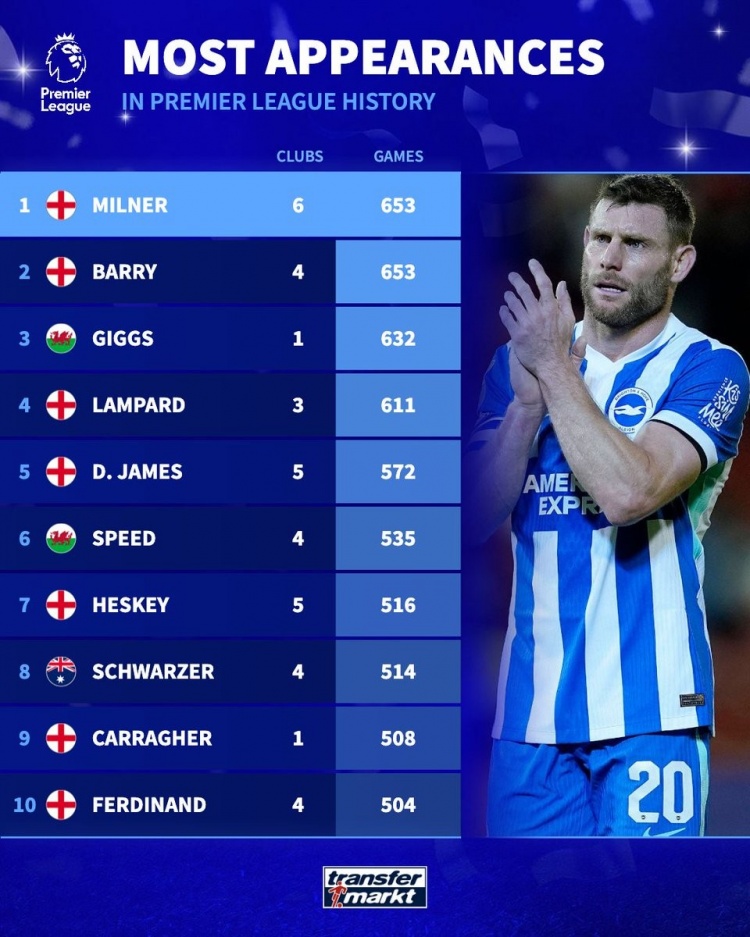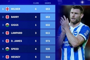 24直播网2月12日讯 布莱顿在本轮英超对阵阿斯顿维拉,40岁米尔纳替补出战。数据统计显示,他也追平巴里并列英超历史出场王。