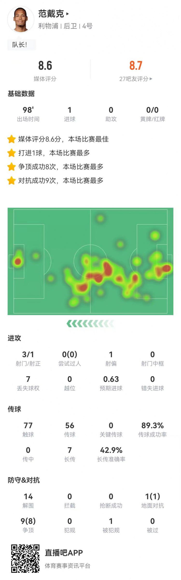 24直播网2月12日讯 利物浦在本轮英超对阵桑德兰,范戴克本场数据如下: