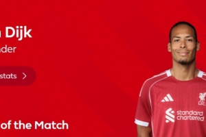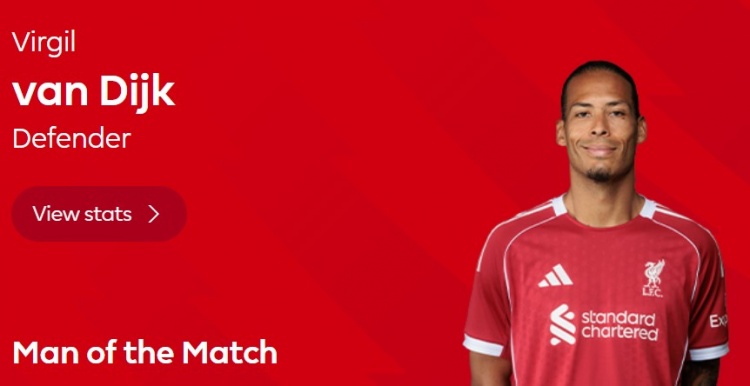 本场比赛范戴克打进全场唯一进球,赛后也当选英超官方球迷票选全场最佳球员。