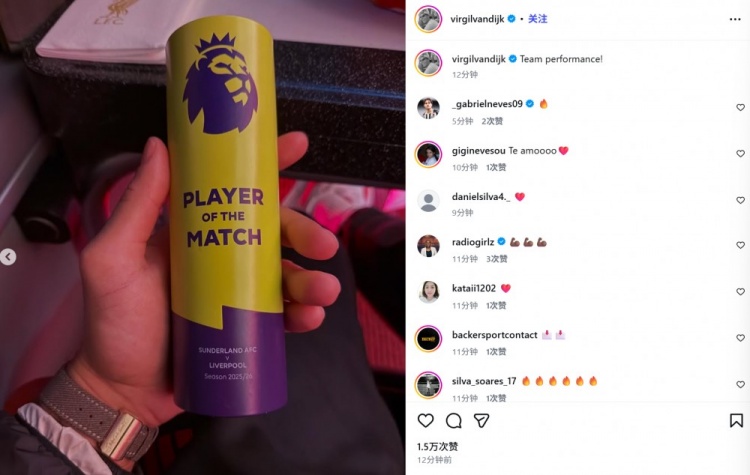 范戴克也在赛后通过社媒晒出英超官方的全场MVP奖杯,并配文:“团队表现!”