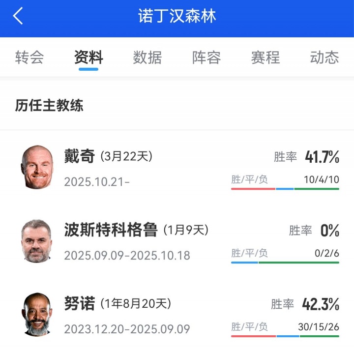 之后前热刺主帅波斯特科格鲁接替努诺,带队8场2平6负未尝胜绩,仅担任森林主帅1个多月就下课。