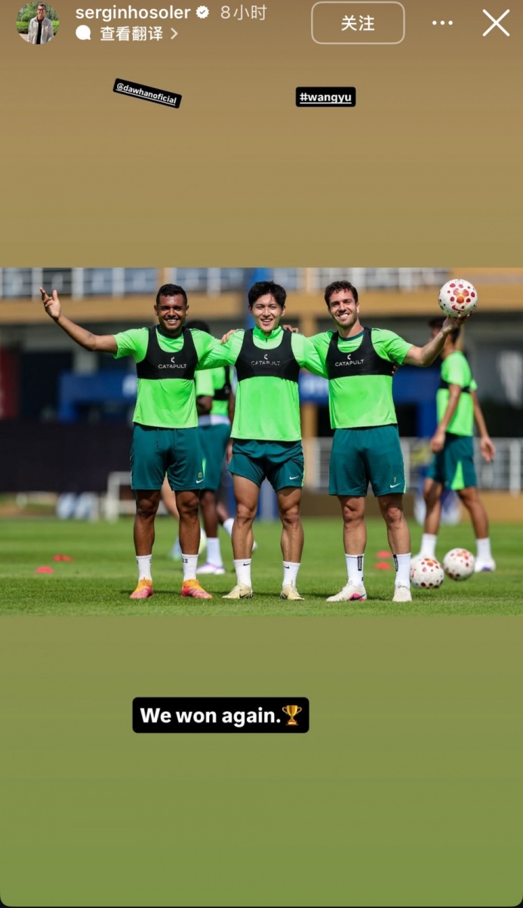 24直播网2月12日讯 今日,国安中场塞尔吉尼奥更新社媒,晒出和队友达万、王禹在训练场的合影,并配文“我们又赢了”。