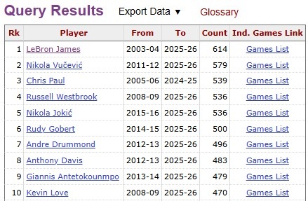 据统计,武切维奇生涯两双数达580场,联盟现役第二多,仅次于詹姆斯的614场。榜单前十如下: