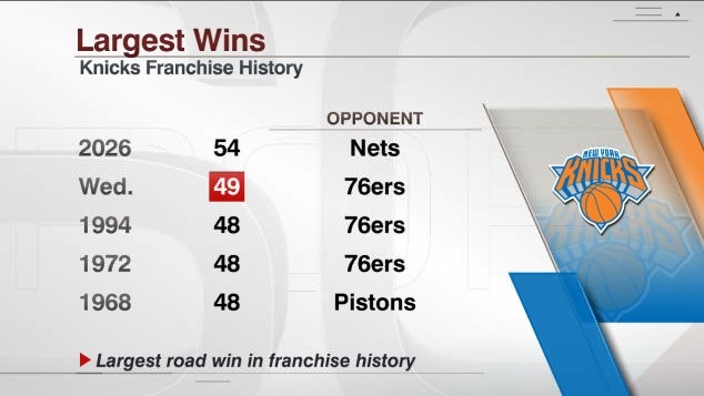 今日 尼克斯大胜76人49分(队史客场最大净胜分)
